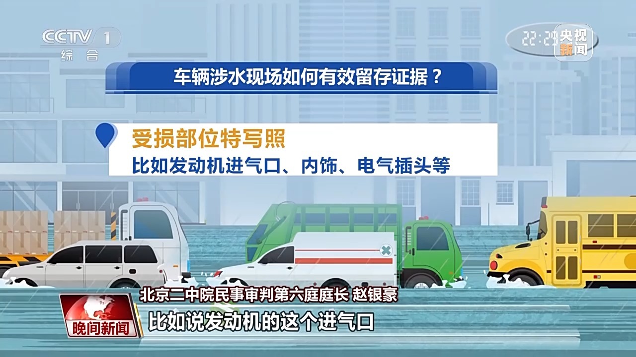 北京二中院民事审判第六庭庭长 赵银豪:最好把车的全景照拍下来,车、车牌还有周边的参照物;把水位线照出来,能够清晰地显示水位是到达了车轮还是到座椅,还是仪表盘都已经淹没了。还有,受损部位的特写,比如发动机的进气口,车内的装置以及电器插头等一些特写部位。